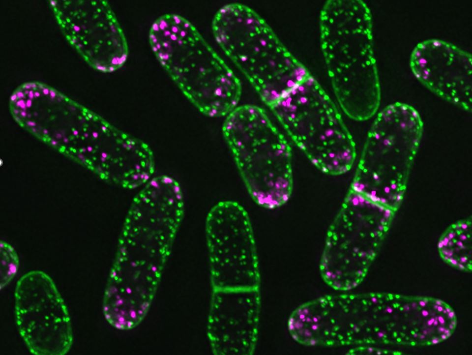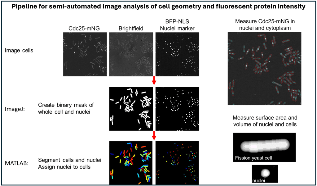 We use fission yeast Schizosaccharomyces pombe as a model organism to study cell size control because they are a eukaryotic single celled organism that uses the same genes and proteins as human cells do to control cell division. They have a simple rod shape and rapid cell cycle making it easy to measure cell growth and cell size by live-cell microscopy. There are also extensive genetic resources, including fission yeast mutants with altered cell size. It is also very easy to delete genes and integrate tags to visualize proteins by live cell microscopy or detect proteins on western blots.
