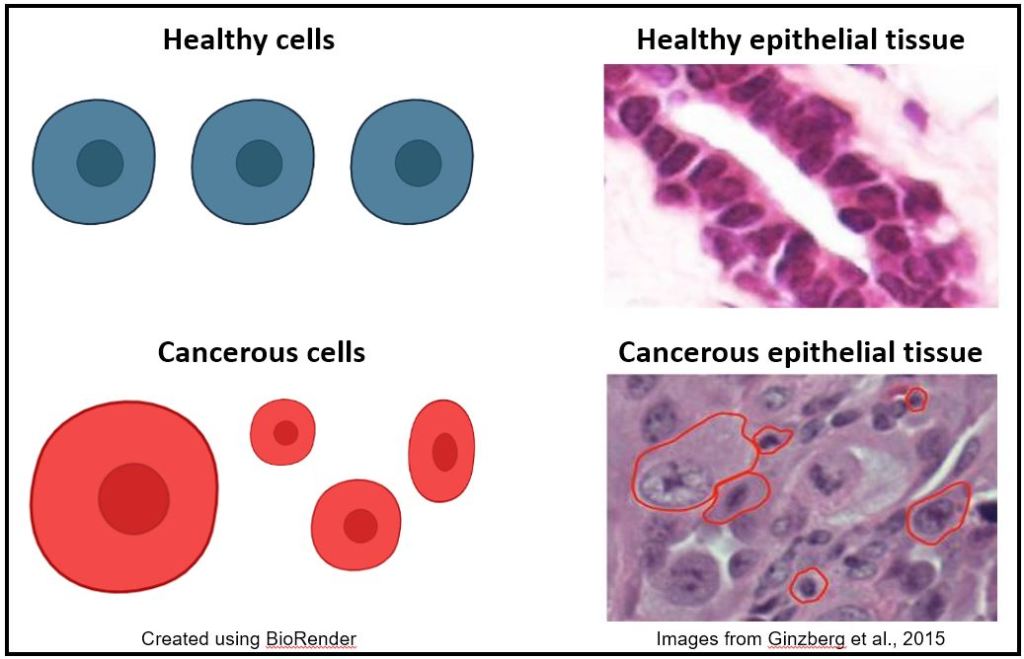 In cancer, this tight control of size is often lost. Abnormal cell size—either much larger or smaller than normal—is a hallmark of many cancers and is used by pathologists to help diagnose the disease (see figure below). These changes in size reflect disruptions in how cancer cells grow and divide.