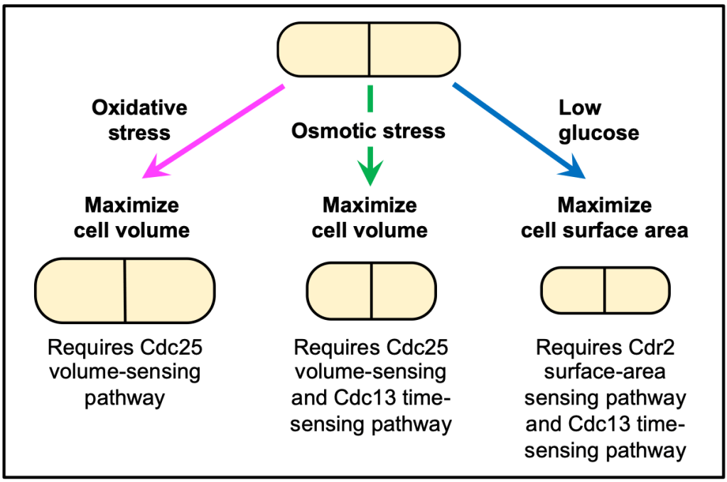 This work highlights how fission yeast use distinct size-sensing pathways to adapt their geometry under different environmental stresses.